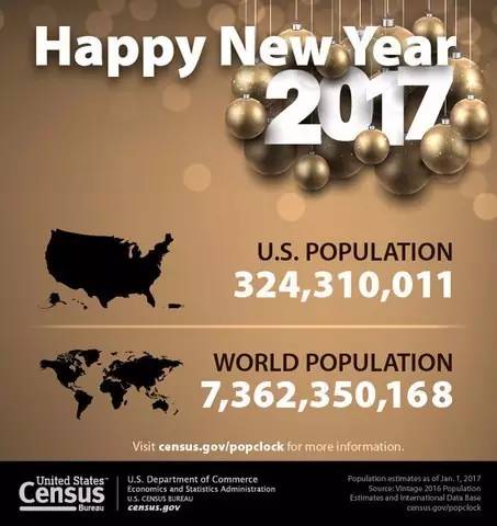 美國人口調(diào)查局給出的預(yù)測顯示,到2017年1月1日,全球人口將達(dá)到7,362,350,168人,較去年同期增長1.07%。美國的人口總數(shù)為324,310,011,較去年同期增長0.7%。2017年1月,全球平均每秒將有4.3人出生,1.8人死亡。(美通社,2016年12月28日華盛頓)